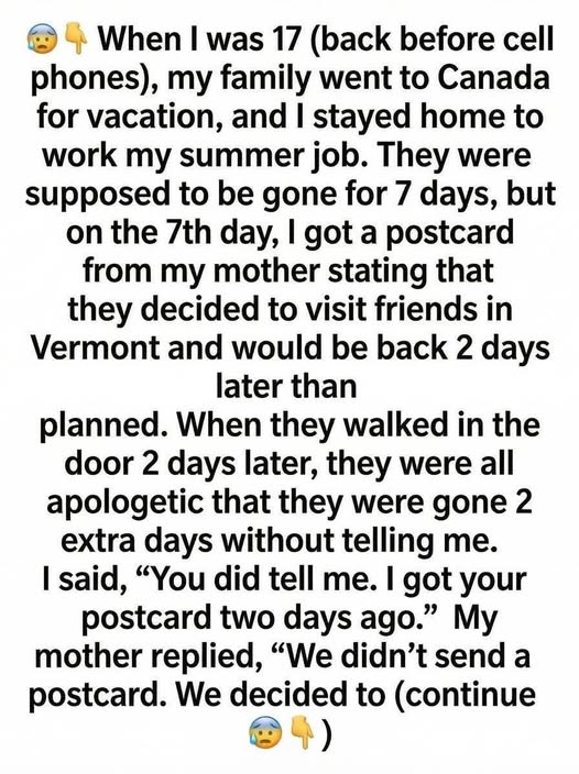 I was seventeen, old enough to taste freedom but still young enough to fear the quiet. The summer my family left for Canada without me, our house felt larger than it ever had—rooms echoing, clocks ticking too loudly, and nights stretching thin. They were supposed to be gone seven days. I worked mornings at a grocery store, came home to microwave dinners, and slept with the radio on for company. On the seventh day, a postcard arrived. It was addressed in my mother’s handwriting, cheerful and looping. She wrote that they had decided to stop in Vermont to visit friends and would return two days later than planned. I remember feeling oddly relieved, like the house itself had exhaled.