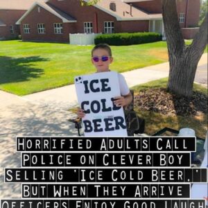 Police are called on boy selling ‘Ice Cold Beer’ but his clever sign has them chuckling