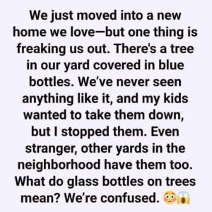 The moment we stepped into our new yard, unease gripped me. There it was—a tree, not ordinary, but draped in countless blue glass bottles. My children pleaded…